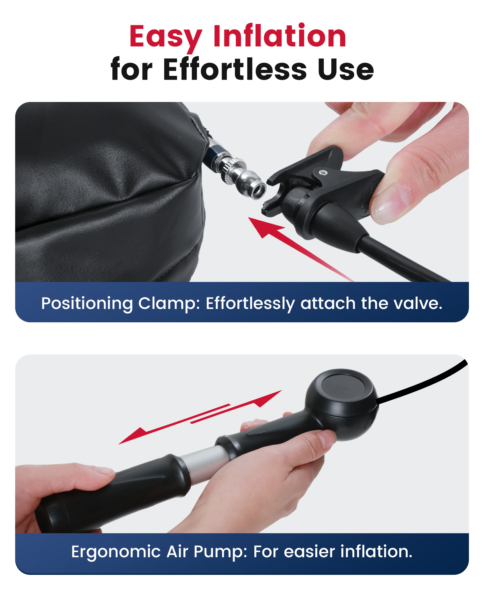 - Effortless Inflation and Leak-proof Design: For a more effortless experience, we upgraded the air pump with an ergonomic design, making inflation quicker and easier. The positioning clip assures quick and precise alignment of air pump and valve, convenient for elderly users. The chair cushion's air chambers are made using advanced high airtightness heat press process, ensuring excellent air retention